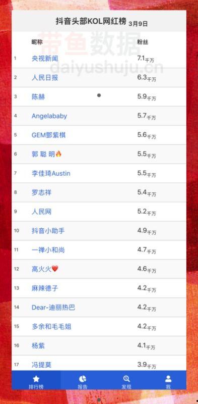 1. 抖音明星排行榜:这个排行榜是根据抖音上的粉丝数量、点赞数和评论数来评定的。在这里,你可以看到当红明星的实时排名,还有他们的最新动态。